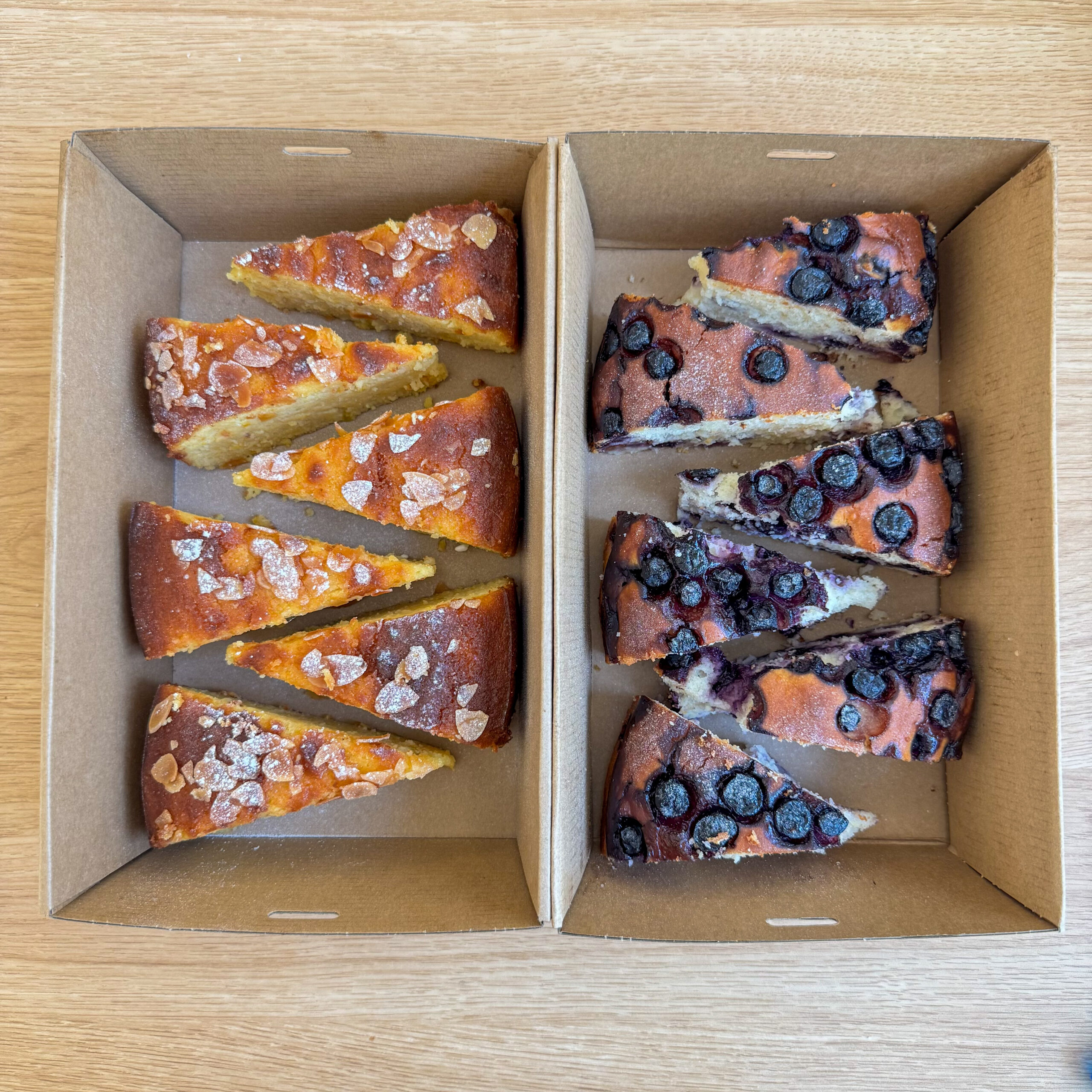 Customers can choose from three options: 10 pieces of Orange & Almond Cake, 10 pieces of Lemon Blueberry Tea Cake, or a Mixed Box with 5 pieces of each flavor, packed separately.