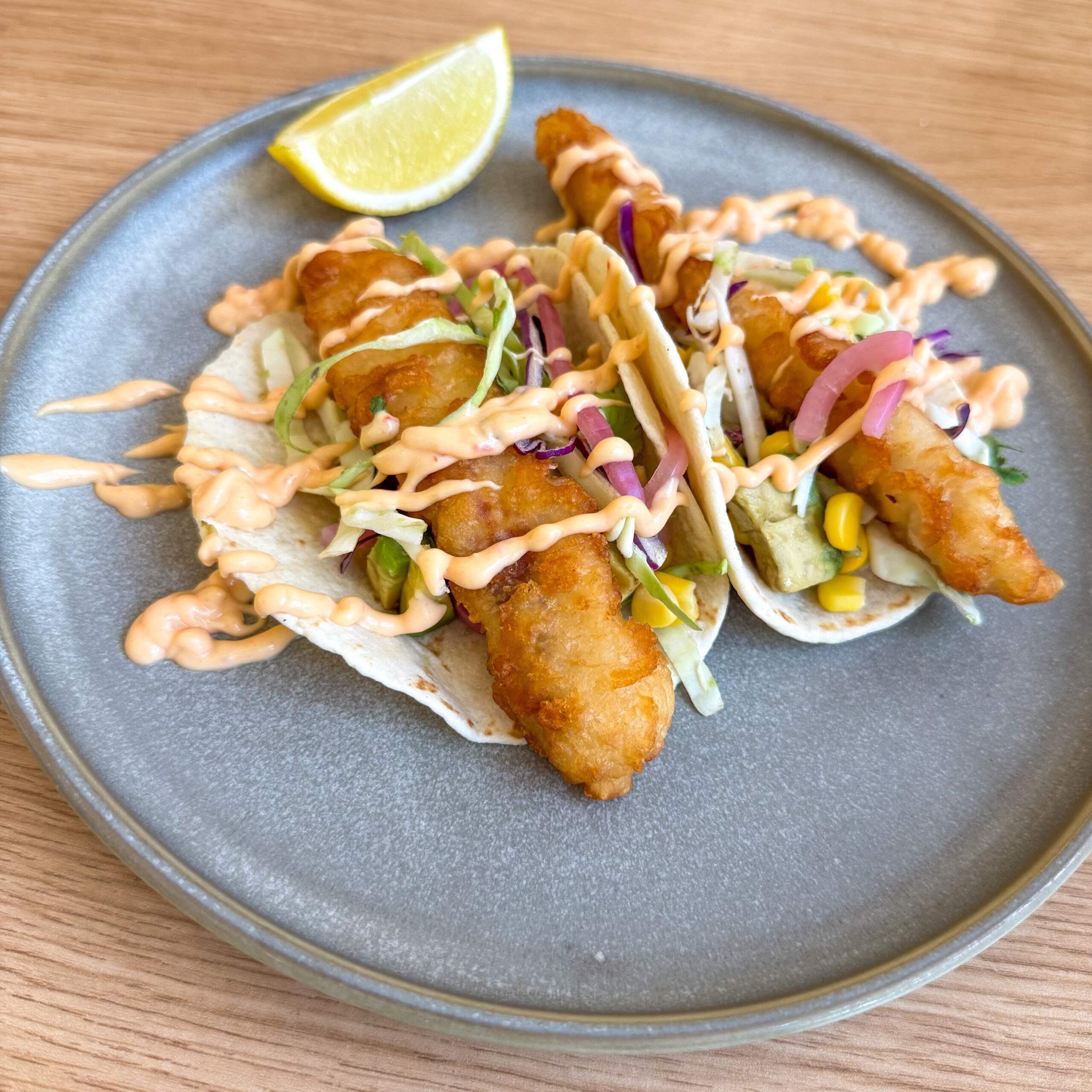 Beer-Battered Fish – Crispy, golden beer-battered fish with cabbage, avocado, house-made pickled onion, coriander, and sweet corn.
